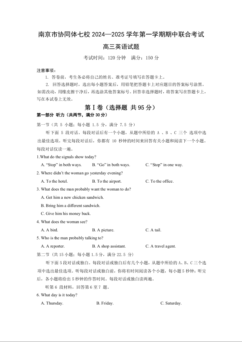 江苏省南京市协同体七校2024-2025学年高三上学期期中联合考试 英语