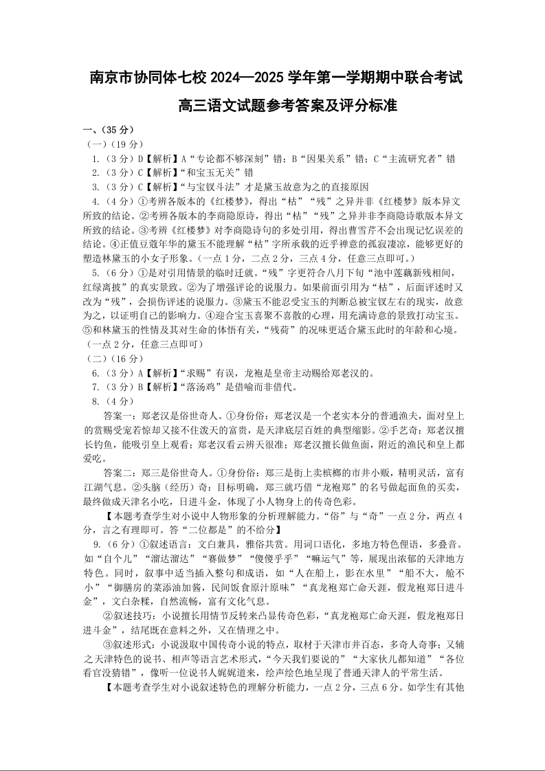 江苏省南京市协同体七校2024-2025学年高三上学期期中联合考试 语文答案