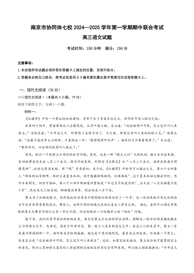 江苏省南京市协同体七校2024-2025学年高三上学期期中联合考试 语文