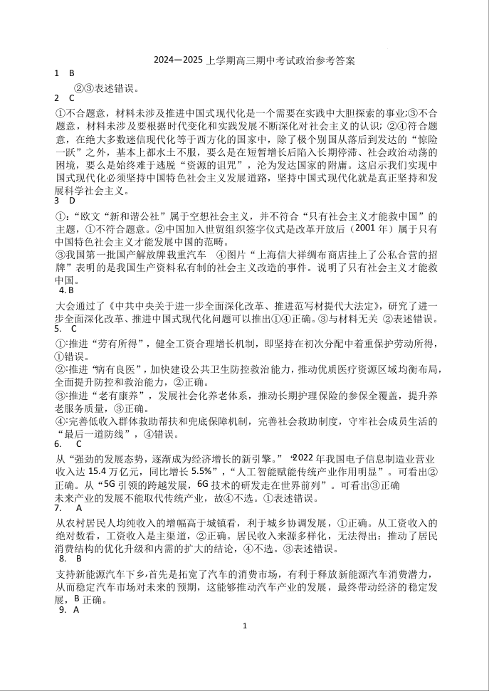 辽宁省鞍山市重点高中协作校2025届高三上学期期中考试 政治答案