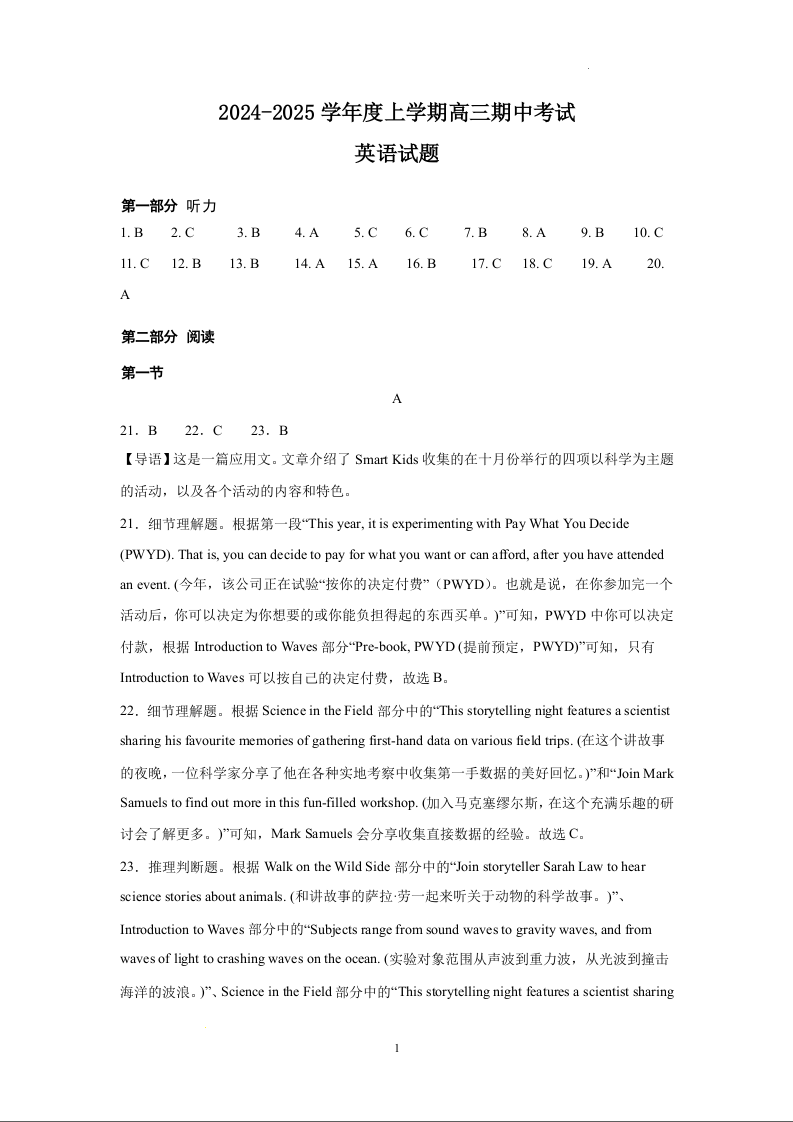 辽宁省鞍山市重点高中协作校2025届高三上学期期中考试 英语答案