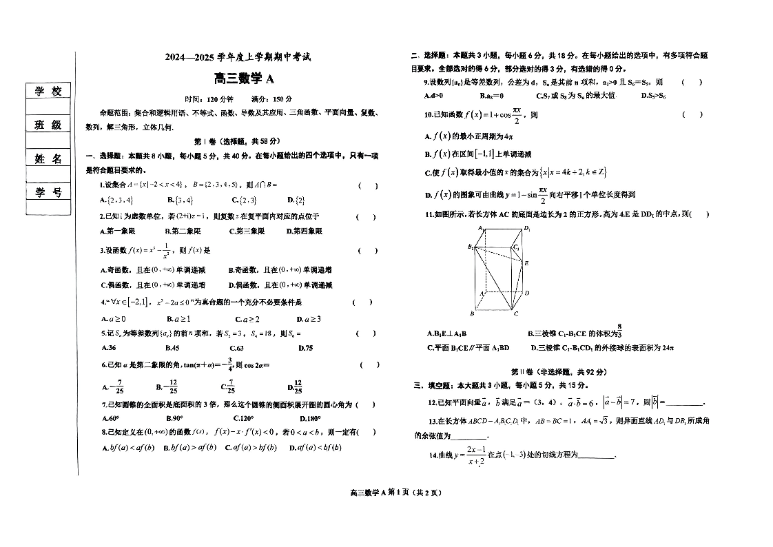 辽宁省鞍山市重点高中协作校2025届高三上学期期中考试 数学