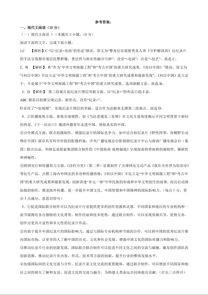 辽宁省鞍山市重点高中协作校2025届高三上学期期中考试 语文答案