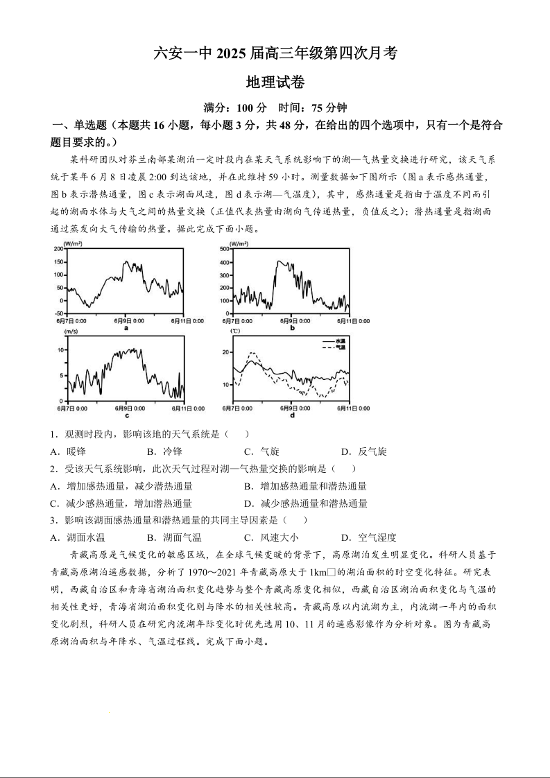 安徽省六安第一中学2025届高三上学期第四次月考 地理
