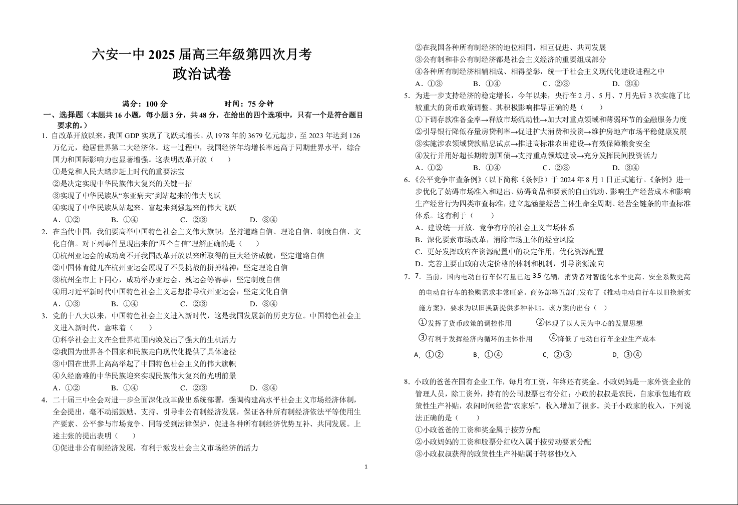 安徽省六安第一中学2025届高三上学期第四次月考 政治
