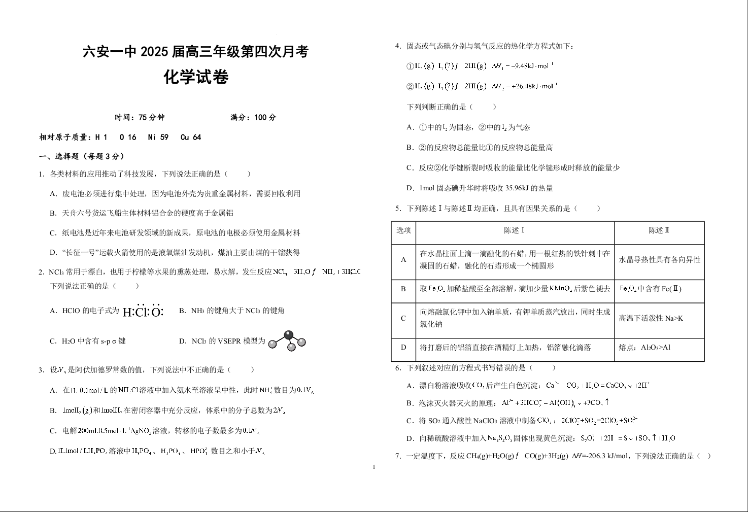 安徽省六安第一中学2025届高三上学期第四次月考 化学