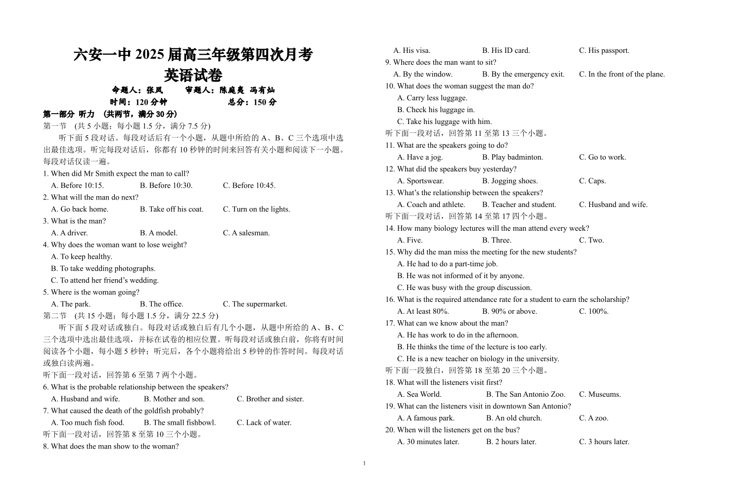 安徽省六安第一中学2025届高三上学期第四次月考 英语