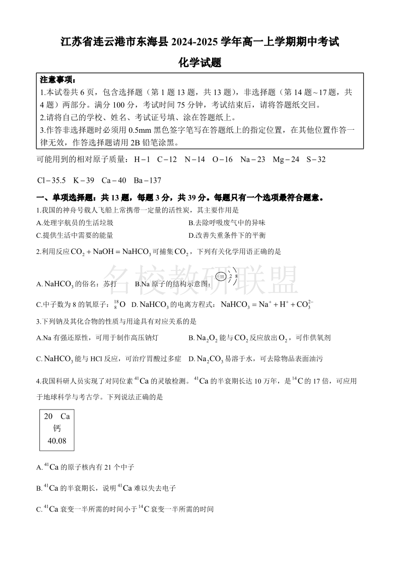 江苏省连云港市东海县2024-2025学年高一上学期期中考试 化学