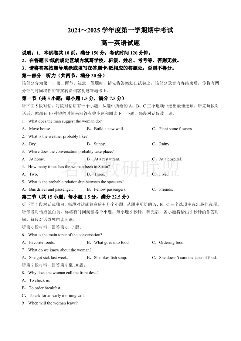 江苏省连云港市东海县2024-2025学年高一上学期期中考试 英语