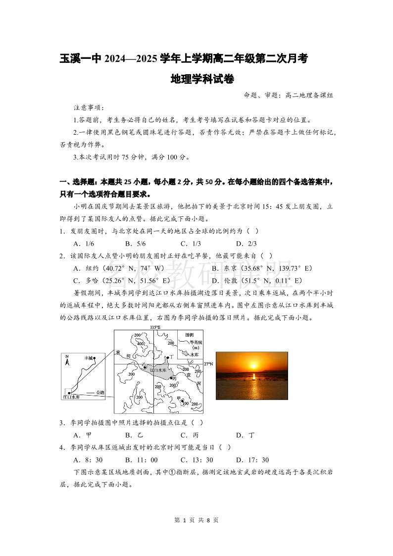 云南省玉溪市一中2024-2025学年高二上学期第二次月考 地理