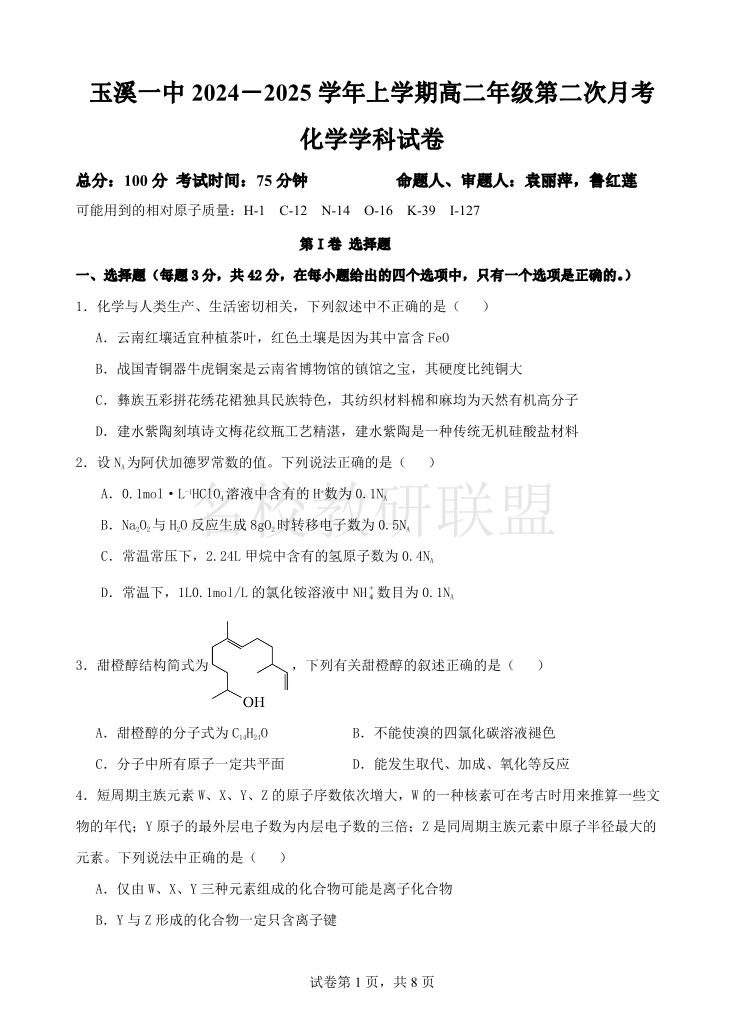 云南省玉溪市一中2024-2025学年高二上学期第二次月考 化学