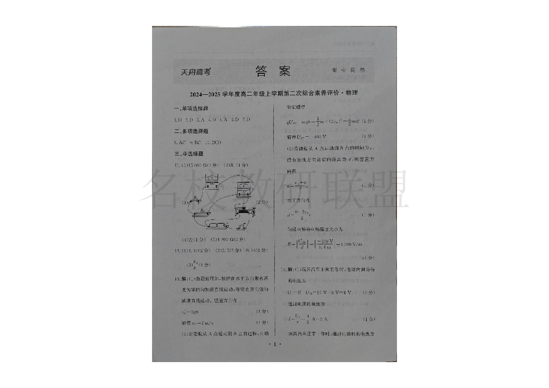 云南省玉溪市一中2024-2025学年高二上学期第二次月考 物理答案