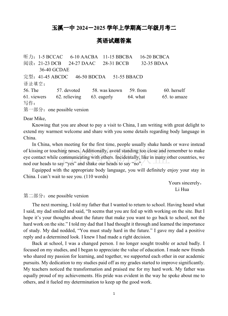 云南省玉溪市一中2024-2025学年高二上学期第二次月考 英语答案
