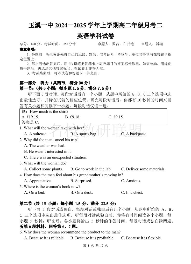 云南省玉溪市一中2024-2025学年高二上学期第二次月考 英语