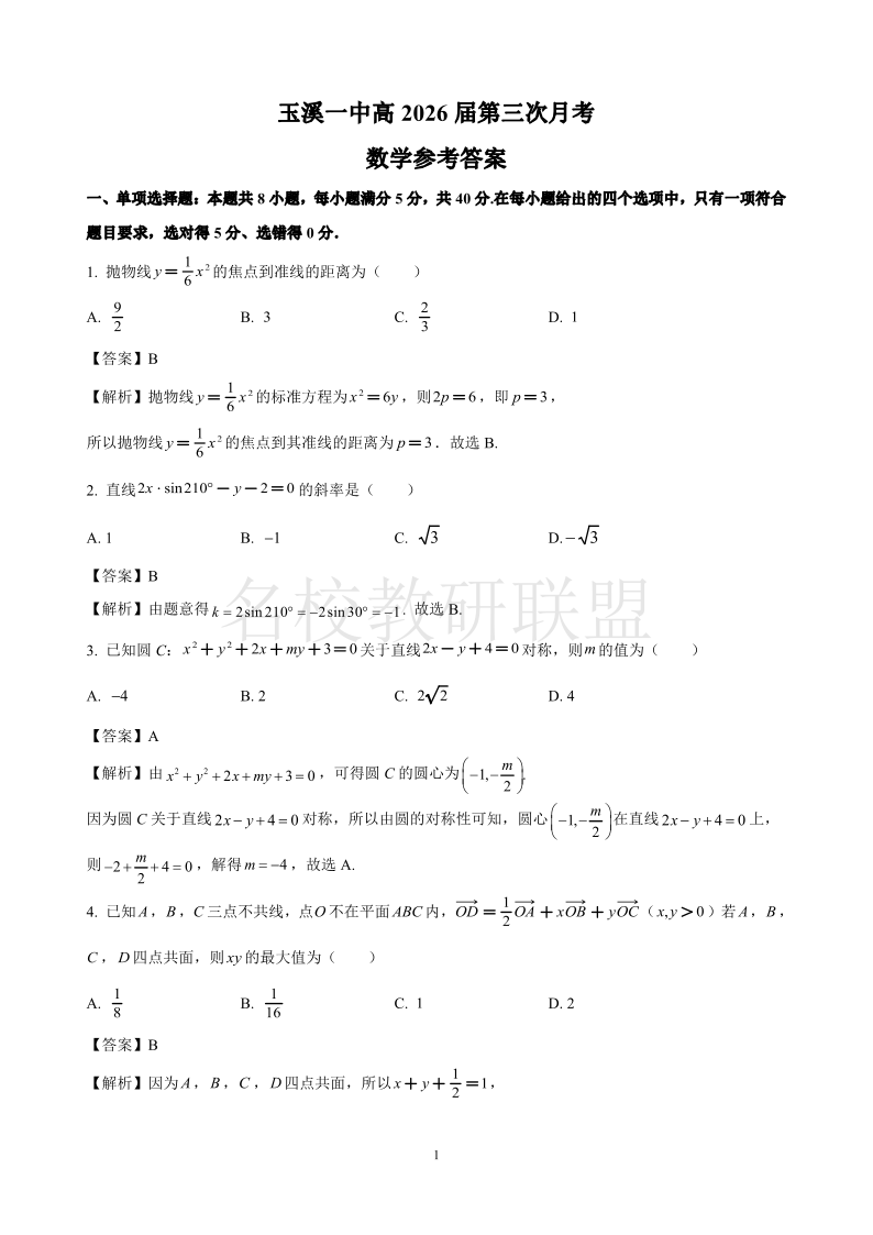 云南省玉溪市一中2024-2025学年高二上学期第二次月考 数学答案