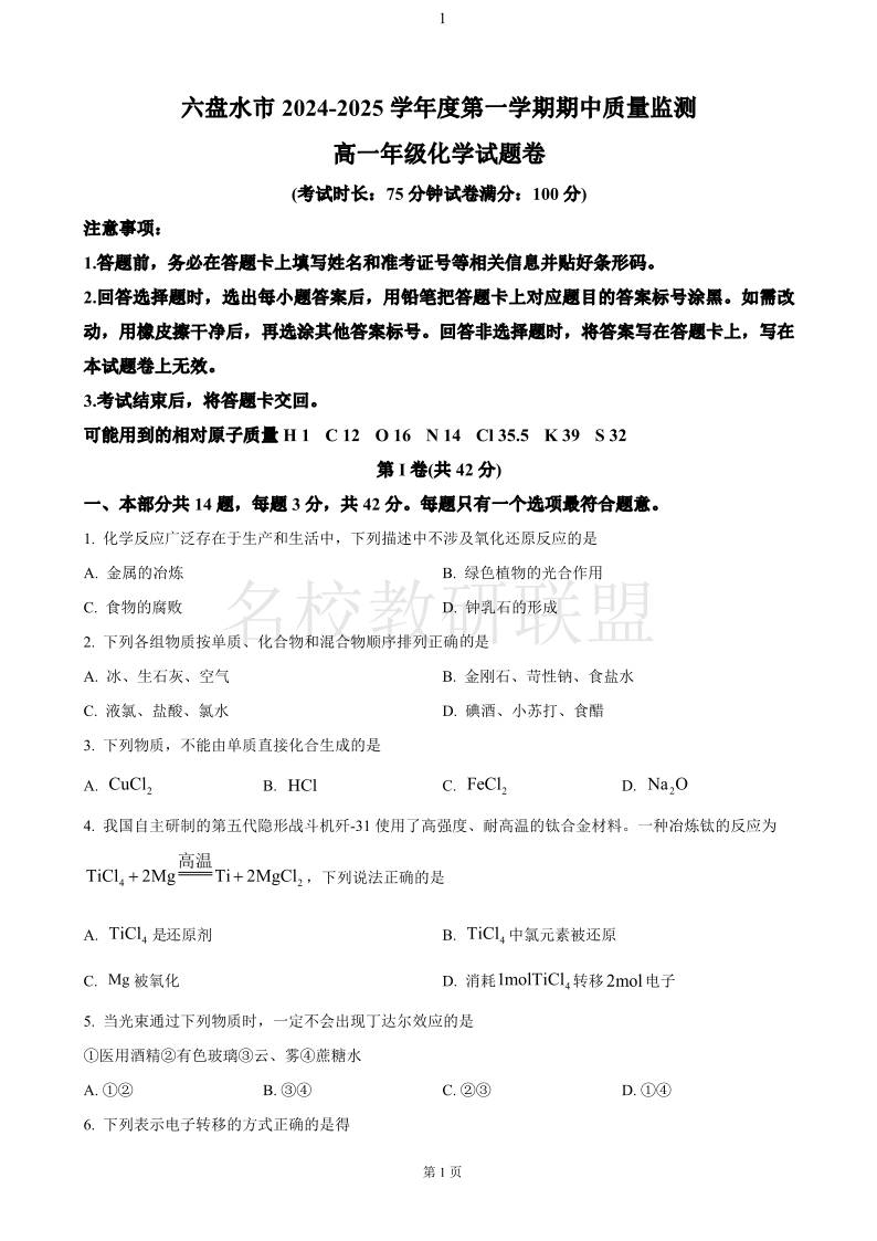 贵州省六盘水市2024-2025学年高一上学期11月期中考试 化学