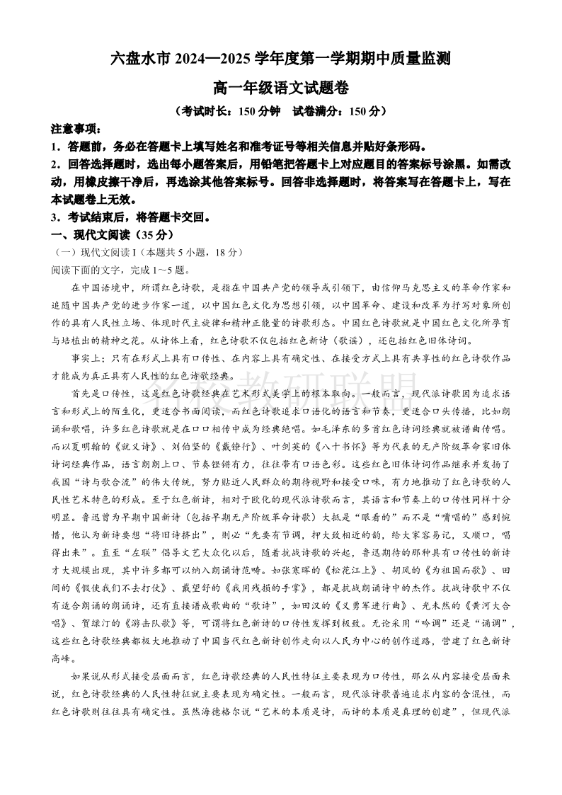 贵州省六盘水市2024-2025学年高一上学期11月期中考试 语文
