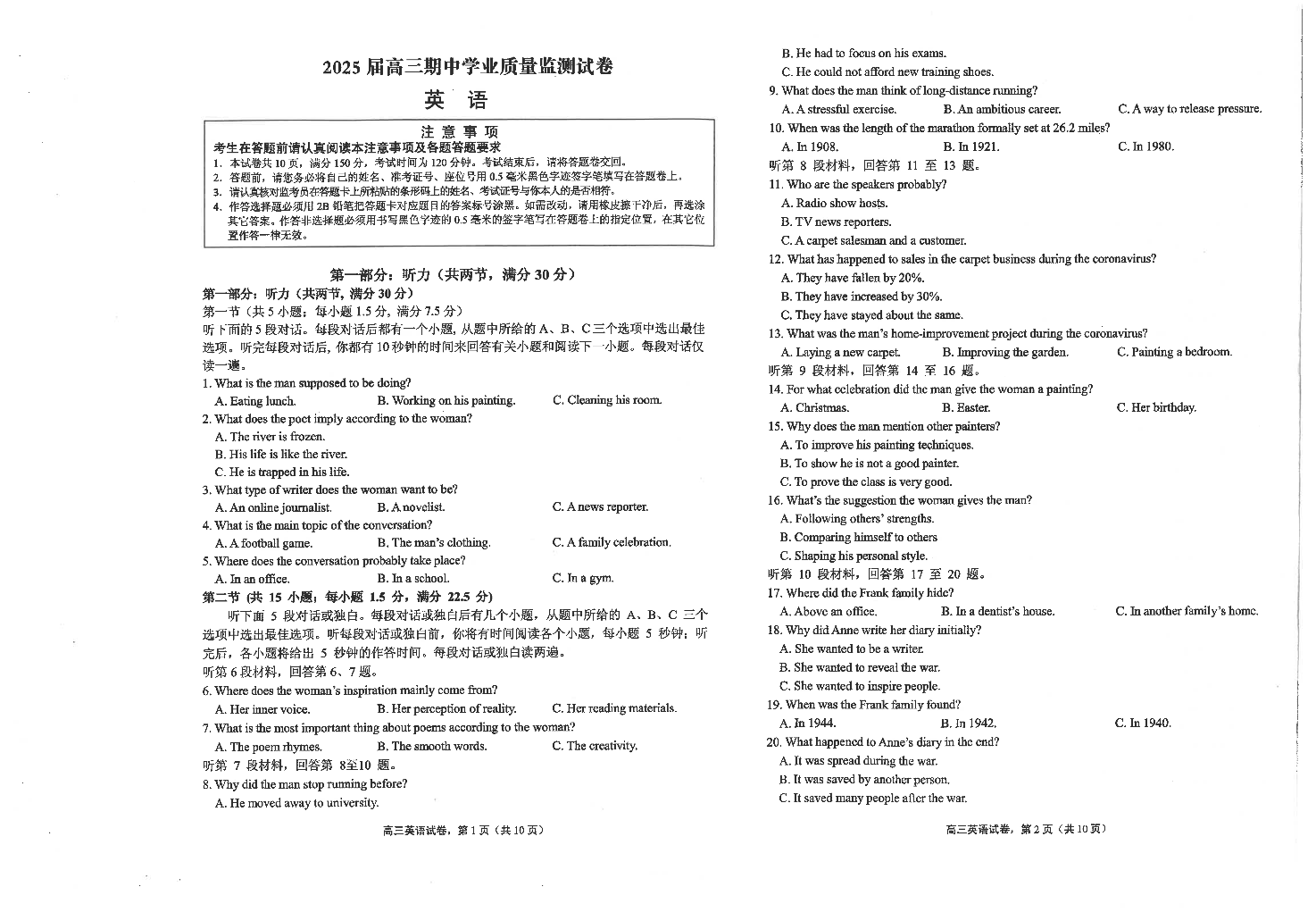 江苏省海安高级中学2025届高三上学期期中考试 英语