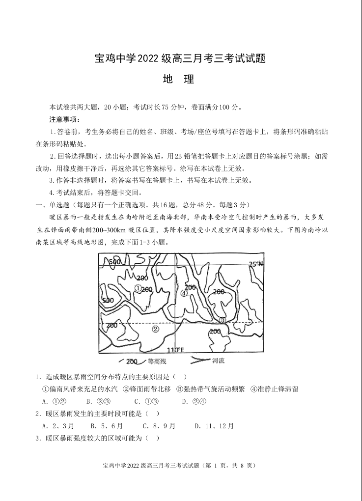 宝鸡中学2022级高三第一学期月考三考试 地理