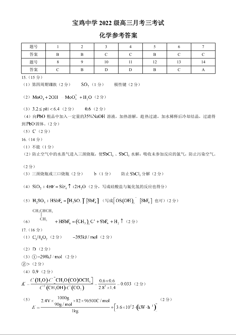 宝鸡中学2022级高三第一学期月考三考试 化学答案