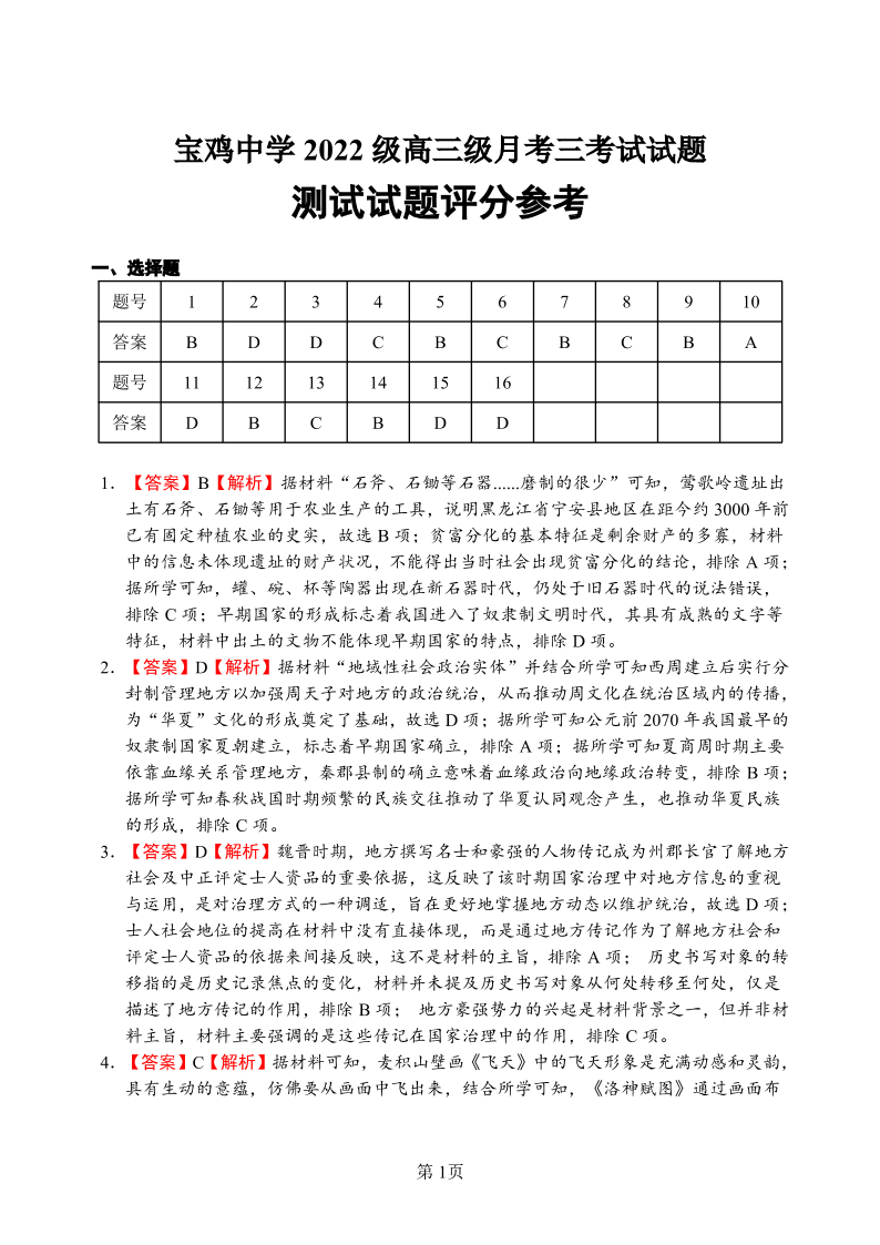 宝鸡中学2022级高三第一学期月考三考试 历史答案