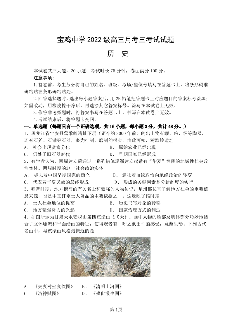 宝鸡中学2022级高三第一学期月考三考试 历史