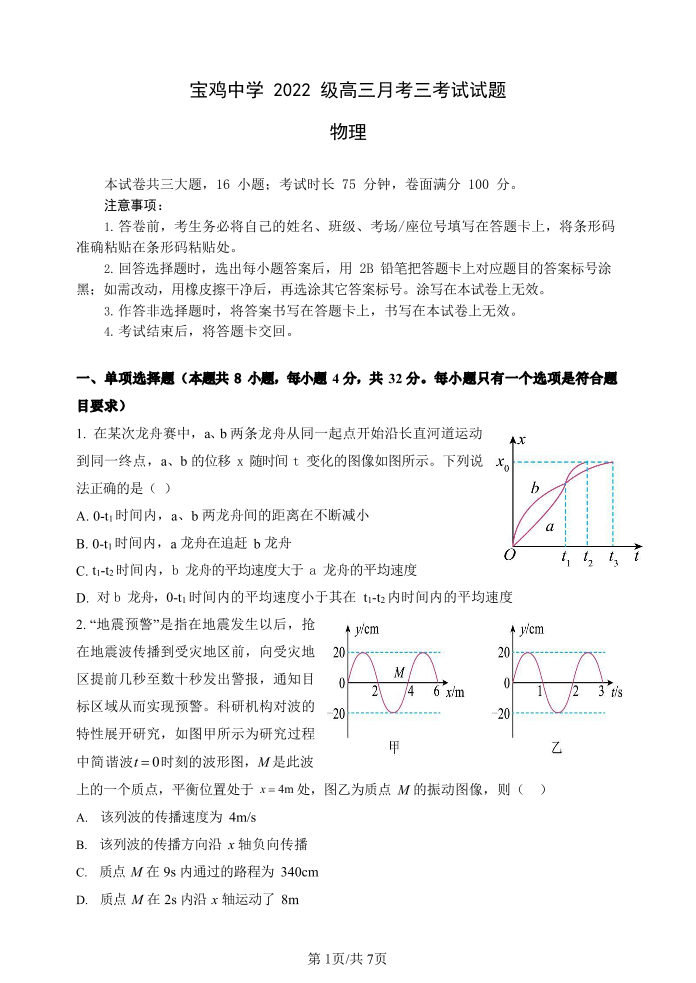 宝鸡中学2022级高三第一学期月考三考试 物理