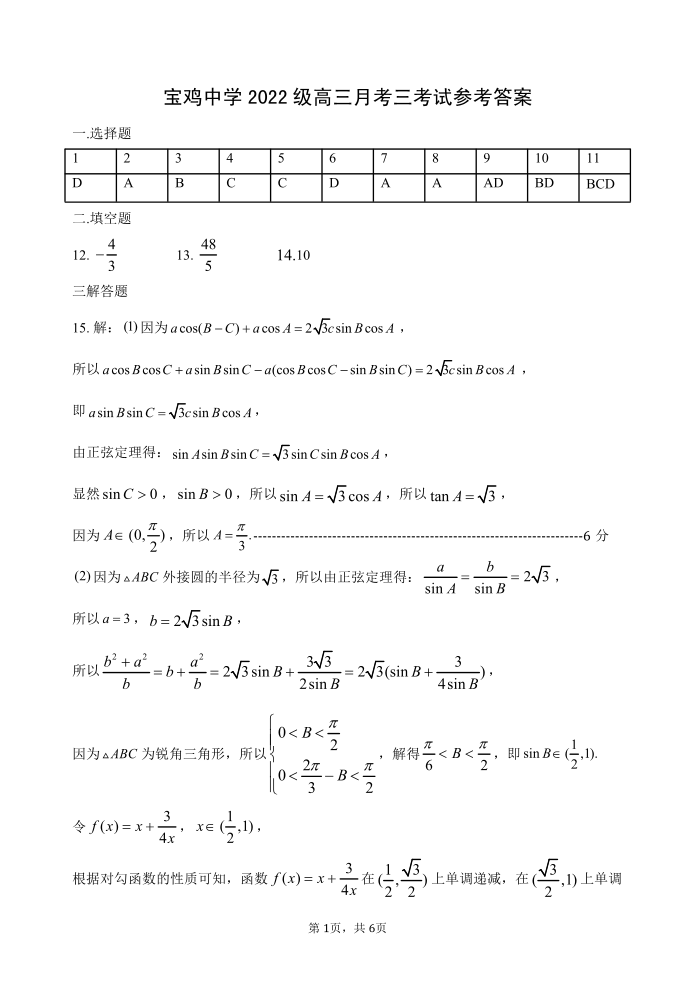 宝鸡中学2022级高三第一学期月考三考试 数学答案