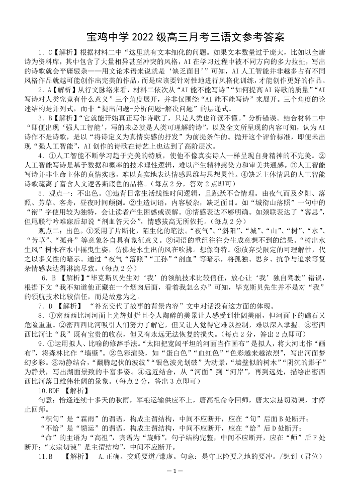 宝鸡中学2022级高三第一学期月考三考试 语文答案