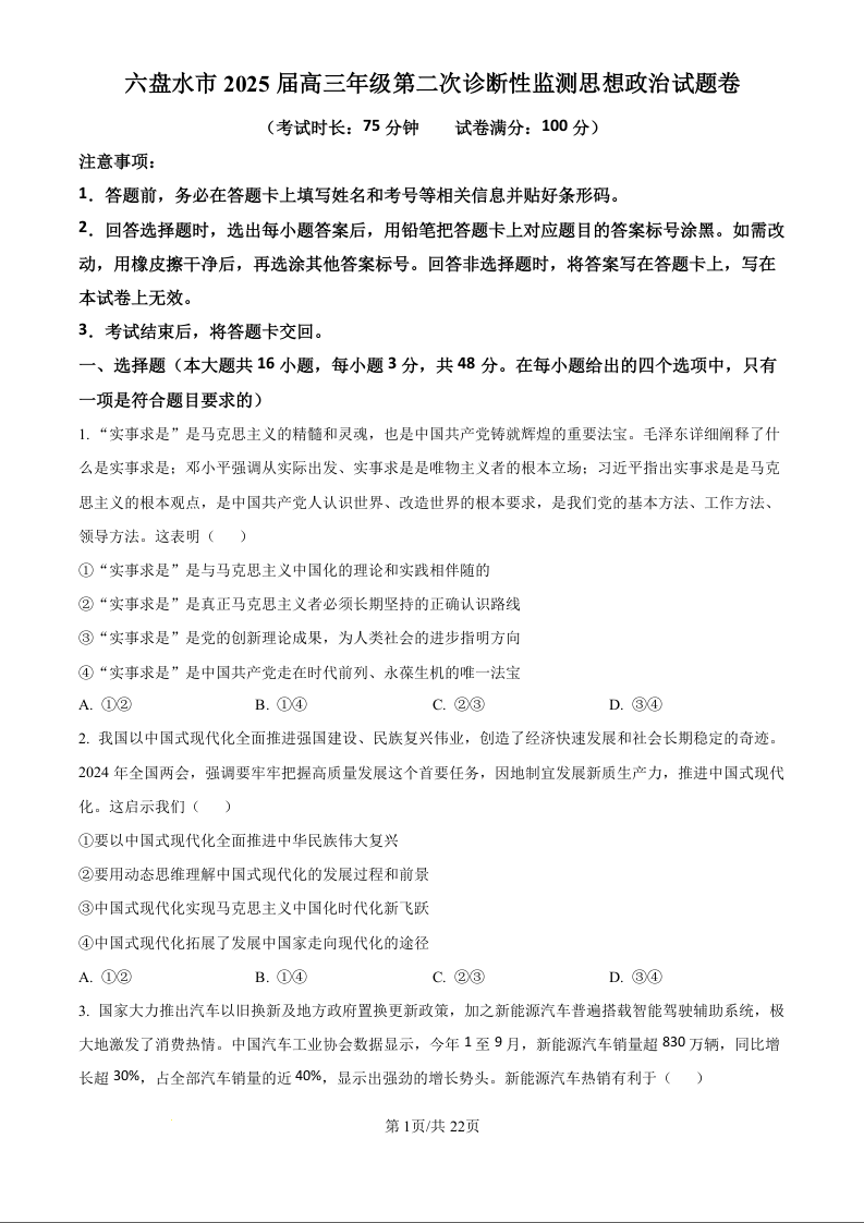 贵州省六盘水市2025届高三上学期第二次诊断性监测 政治