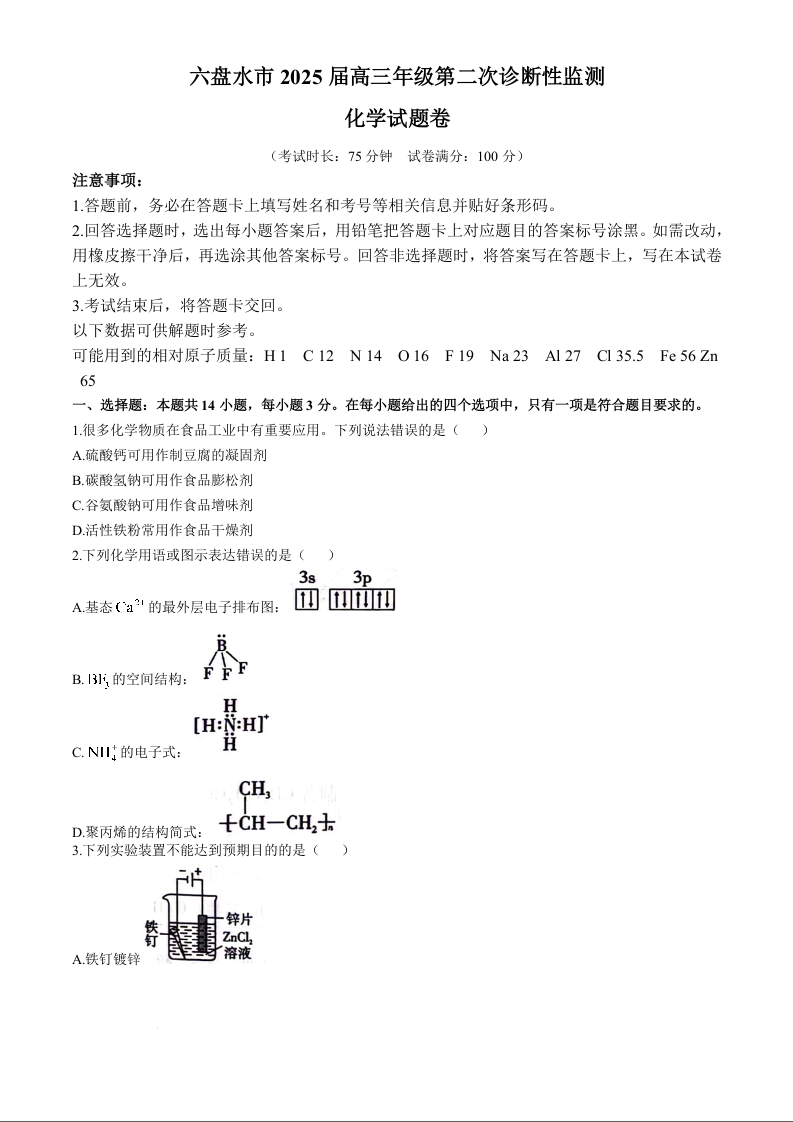 贵州省六盘水市2025届高三上学期第二次诊断性监测 化学