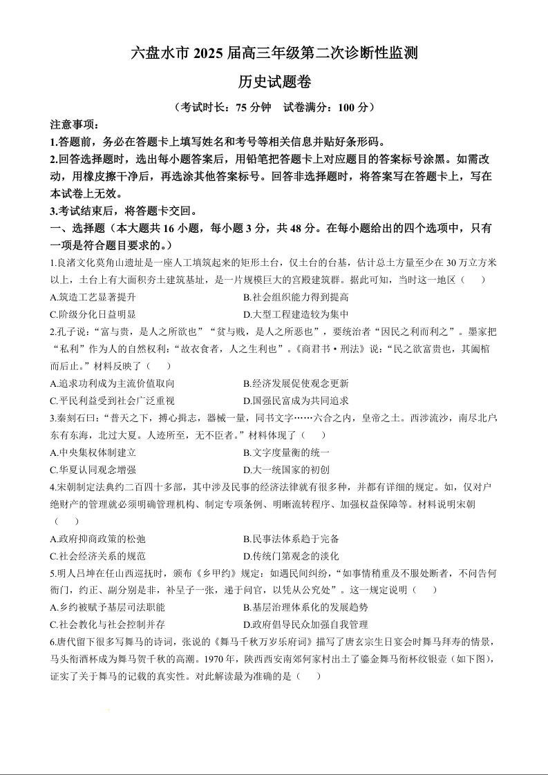 贵州省六盘水市2025届高三上学期第二次诊断性监测 历史