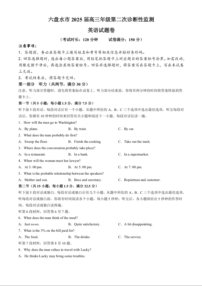 贵州省六盘水市2025届高三上学期第二次诊断性监测 英语