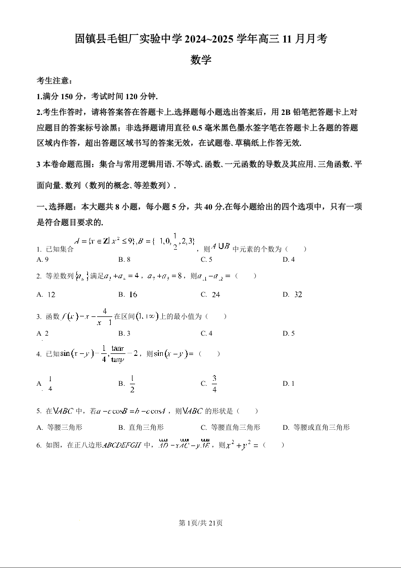 安徽毛坦厂实验中学2025届高三11月期中考试 数学