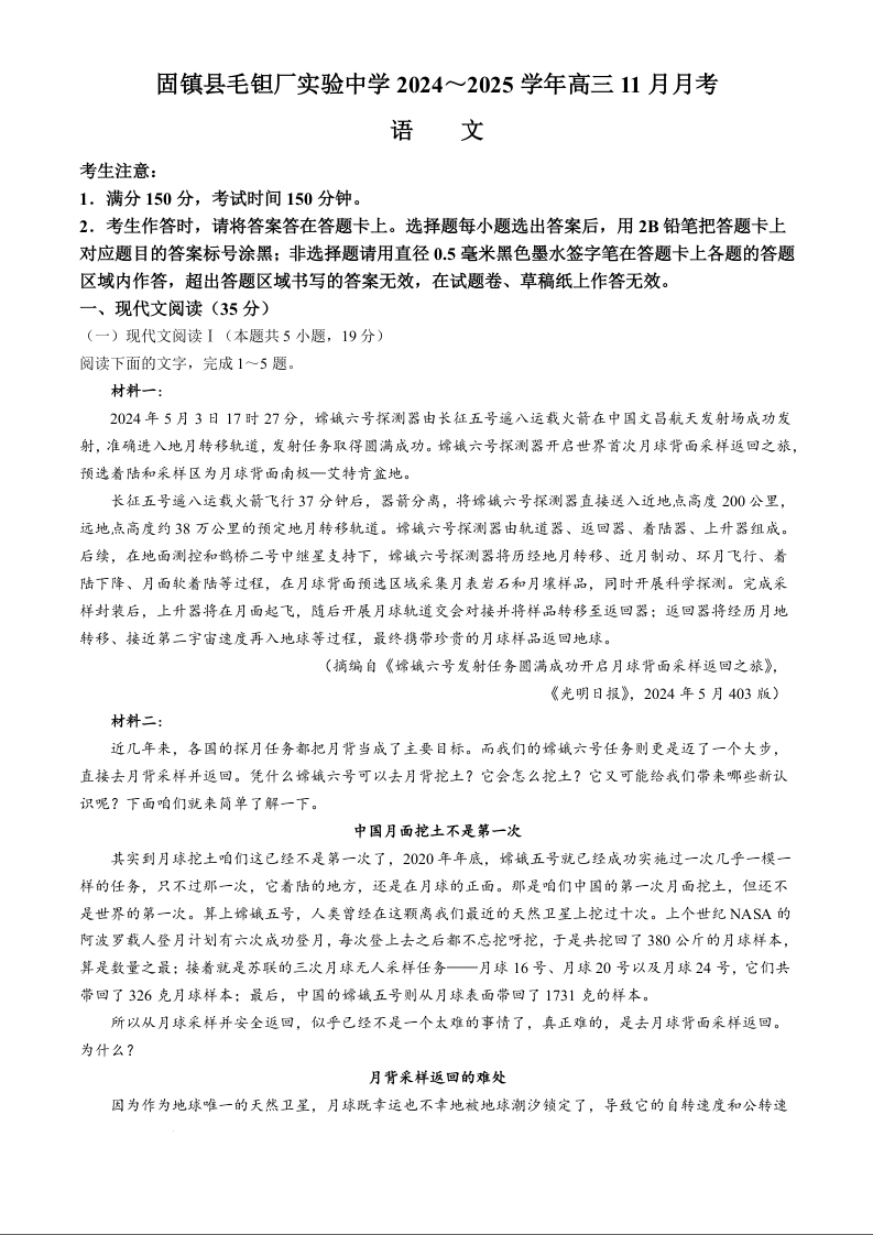 安徽毛坦厂实验中学2025届高三11月期中考试 语文