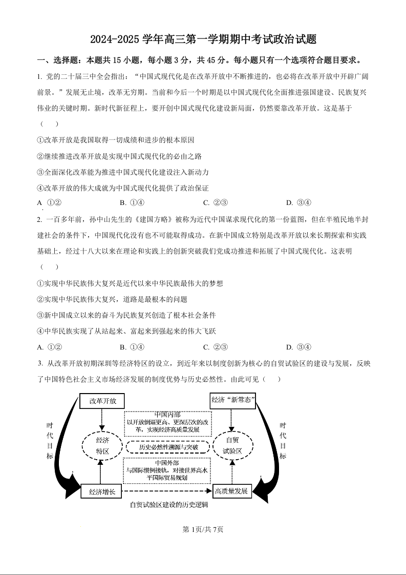 山东省济南第一中学2025届高三上学期期中学情检测 政治