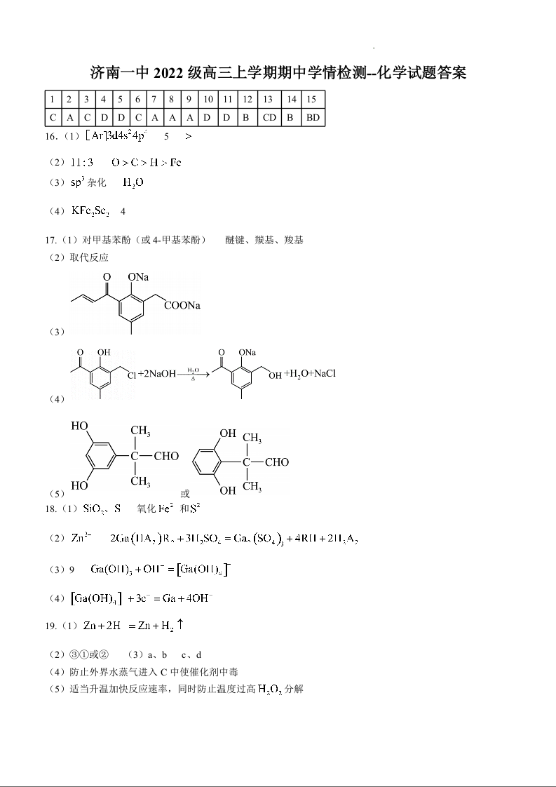 山东省济南第一中学2025届高三上学期期中学情检测 化学答案