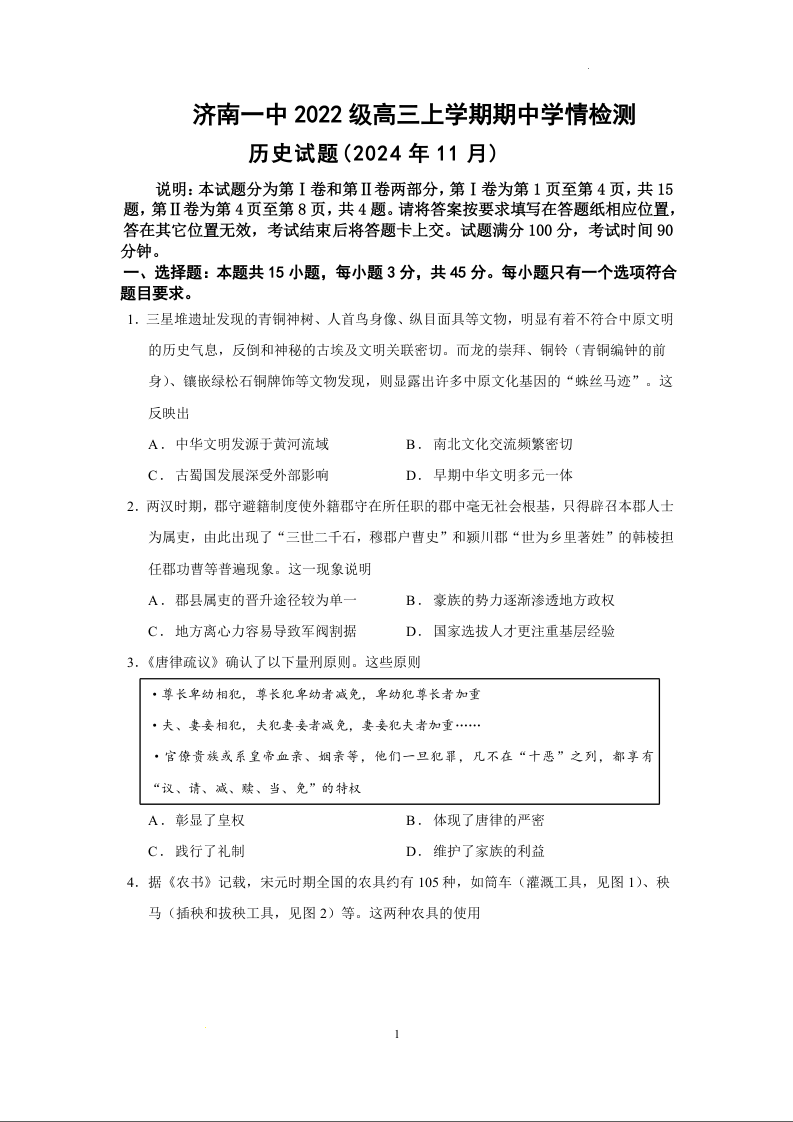 山东省济南第一中学2025届高三上学期期中学情检测 历史