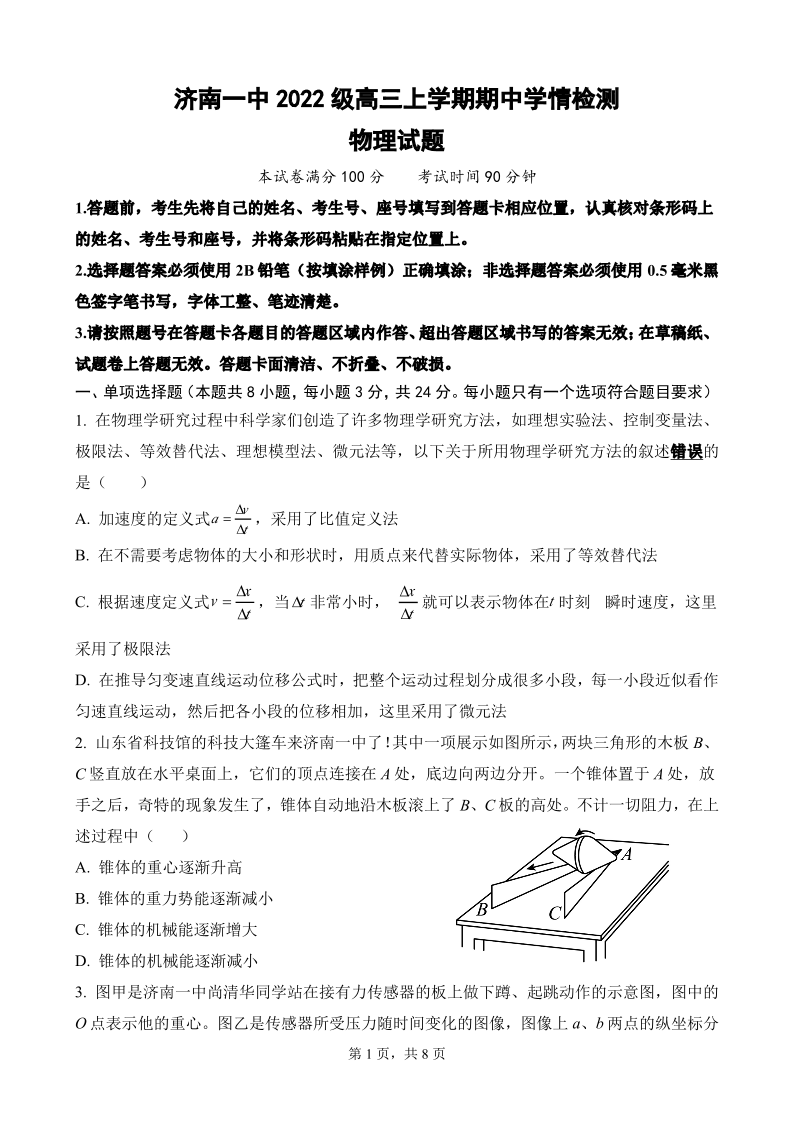 山东省济南第一中学2025届高三上学期期中学情检测 物理