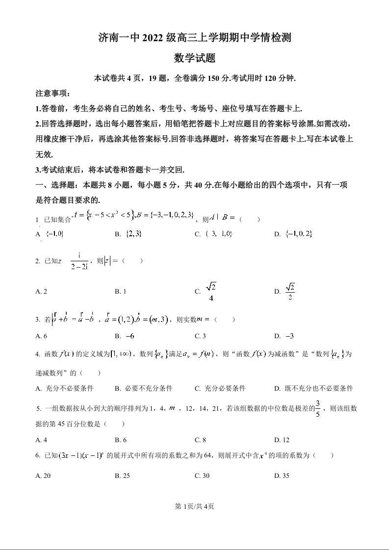 山东省济南第一中学2025届高三上学期期中学情检测 数学