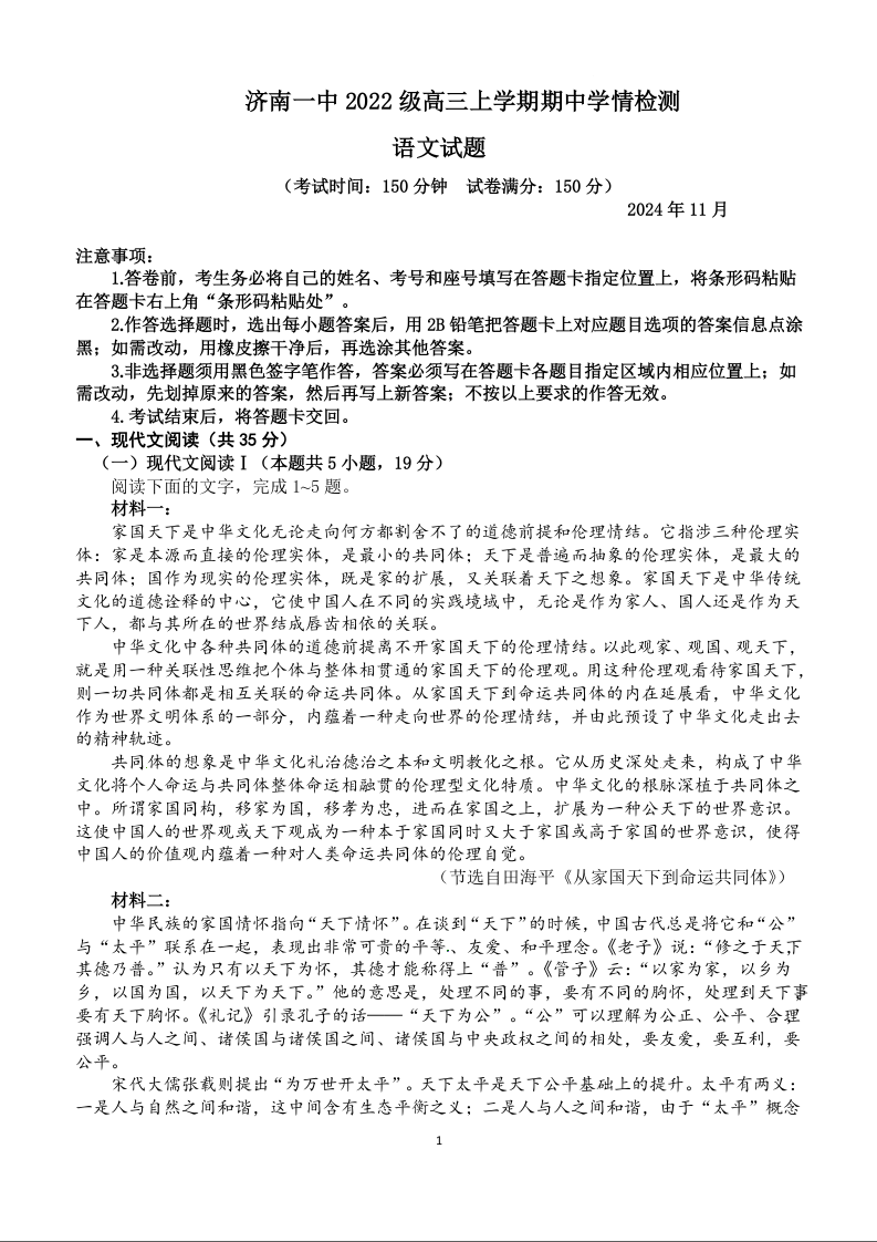 山东省济南第一中学2025届高三上学期期中学情检测 语文