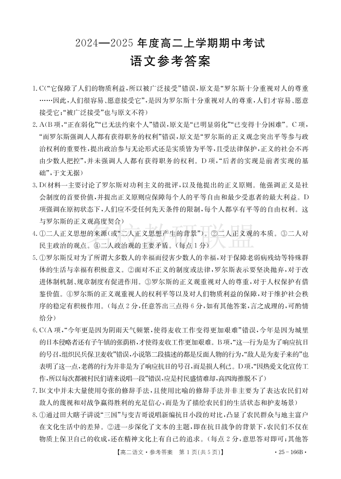 广东省名校联盟2024-2025学年高二上学期期中考试 语文答案