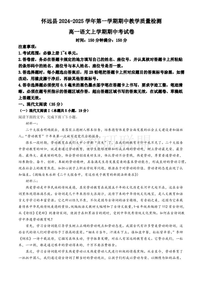 安徽省蚌埠市怀远县2024-2025学年高一上学期期中考试 语文