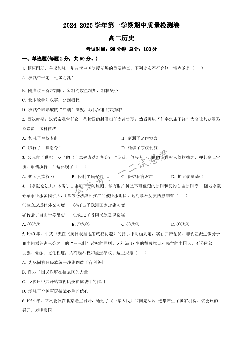 甘肃省武威市凉州区2024-2025学年高二上学期期中质量检测 历史