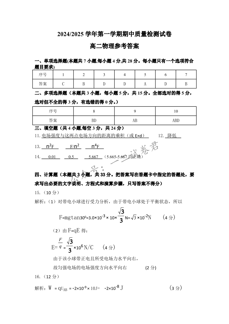 甘肃省武威市凉州区2024-2025学年高二上学期期中质量检测 物理答案