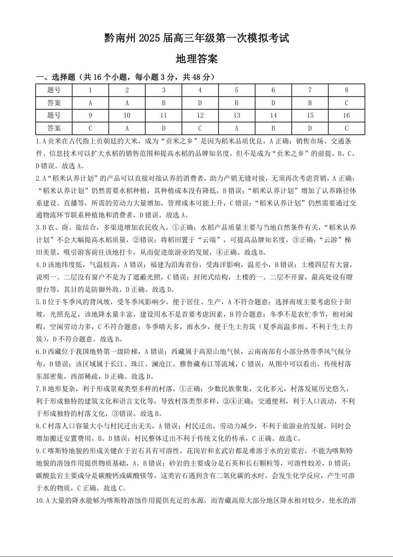 黔南州2025届高三年级第一次模拟考试 地理答案
