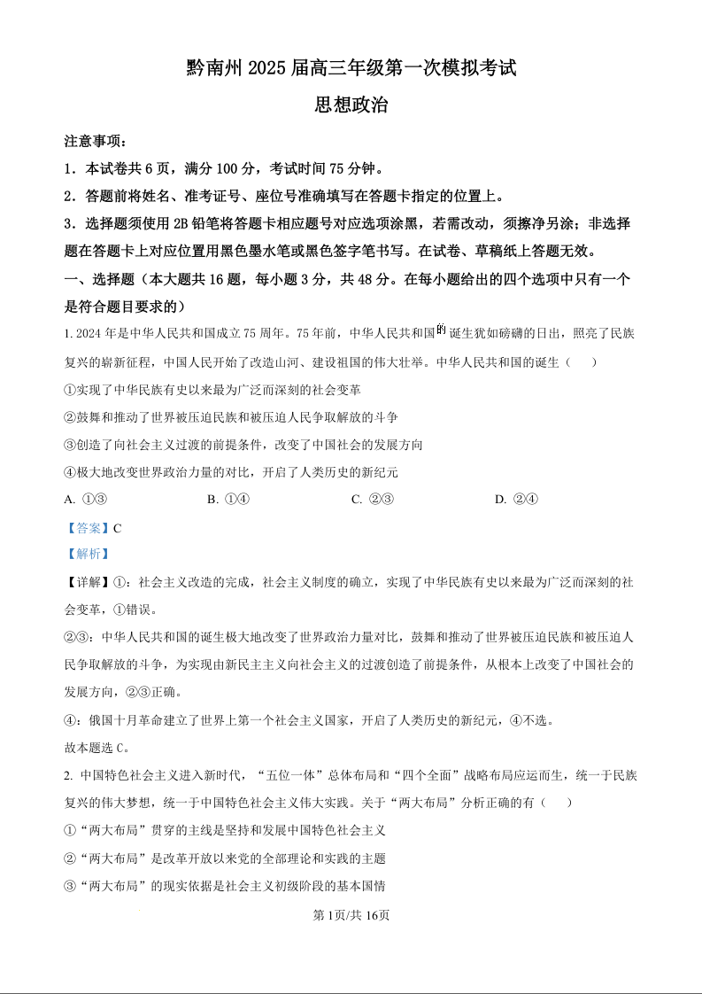 黔南州2025届高三年级第一次模拟考试 政治答案