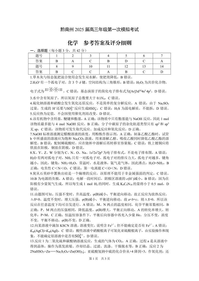黔南州2025届高三年级第一次模拟考试 化学答案