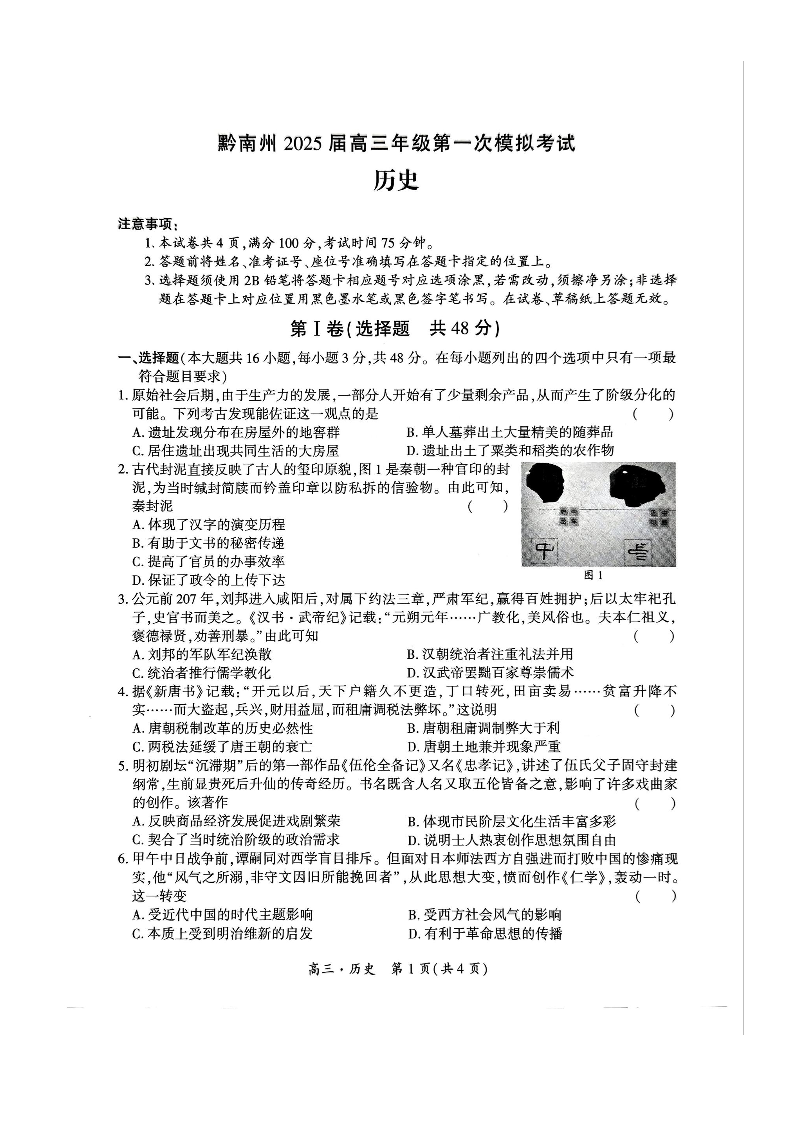 黔南州2025届高三年级第一次模拟考试 历史