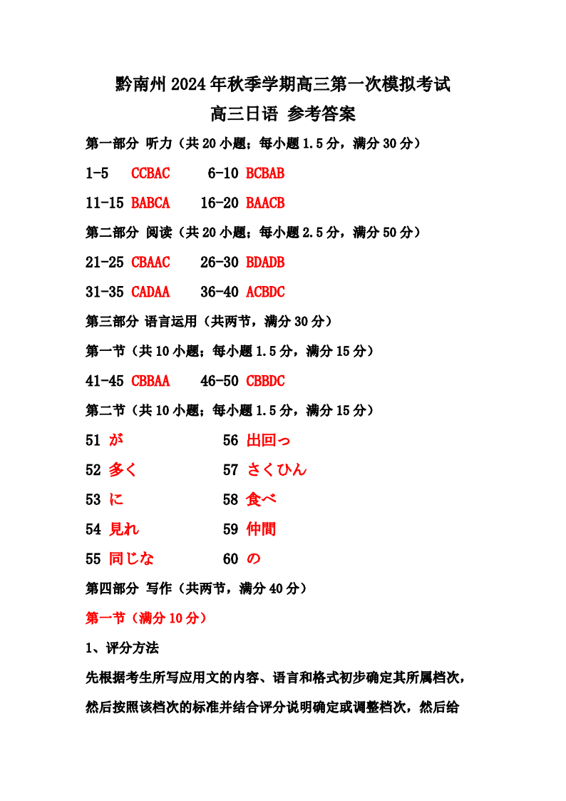 黔南州2025届高三年级第一次模拟考试 日语答案